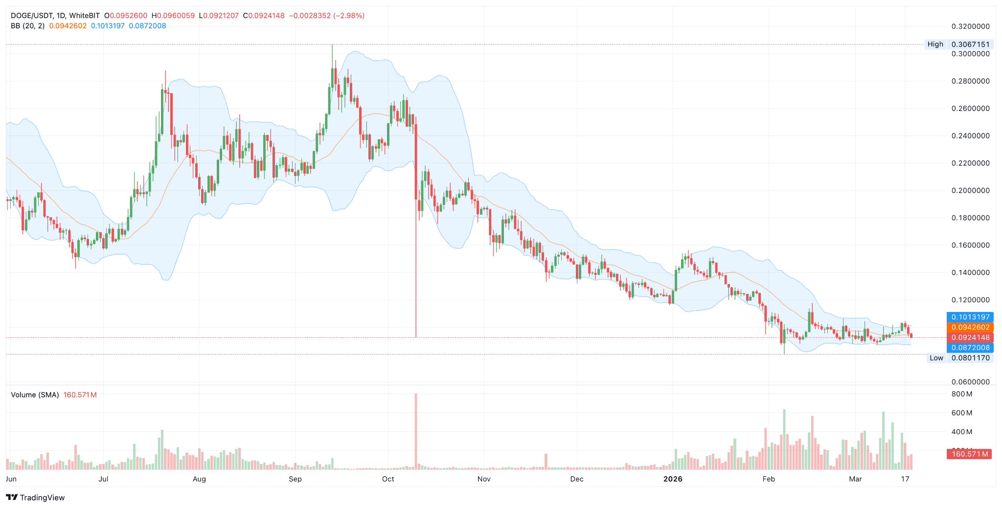 2. Dogecoin 的布林帶信號看跌延續