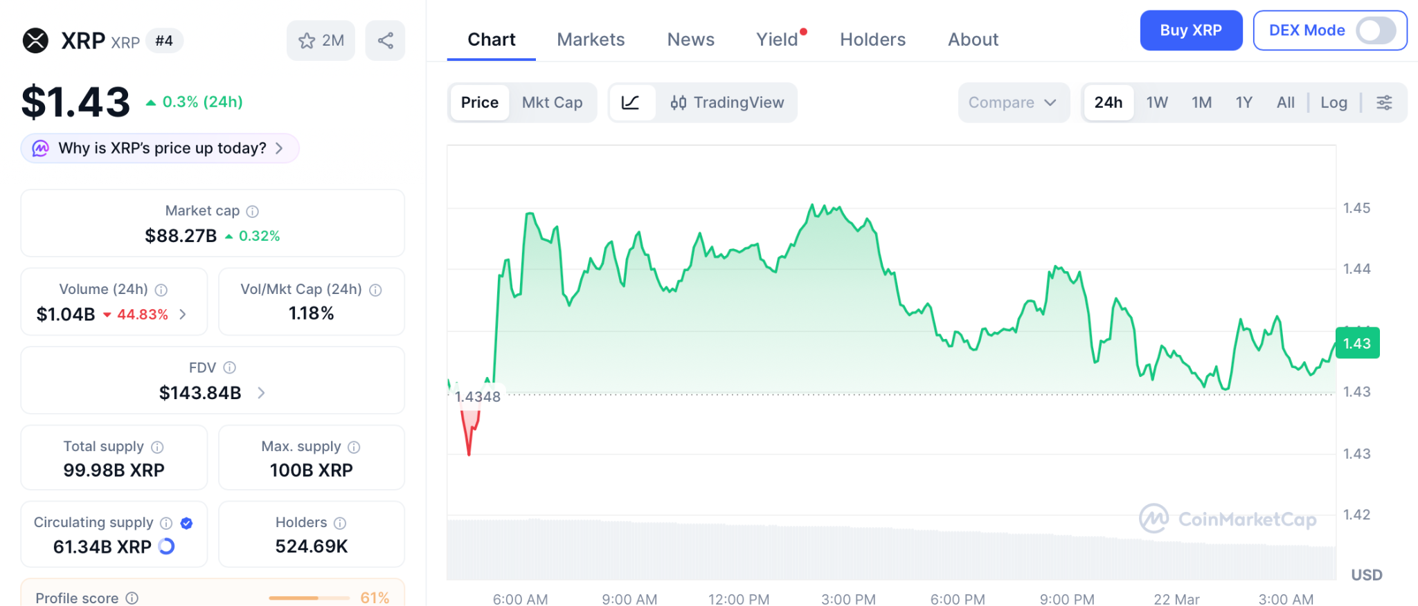 根據 CoinMarketCap 的數據,XRP 目前交易價格為 1.43 美元,較 2025 年 7 月 3.65 美元的歷史高點下跌了 60%。Standard Chartered 對 2026 年的目標價為 2.80 美元。如果《CLARITY Act》在 4 月前通過,更廣泛的預測範圍在 5 至 10 美元之間。